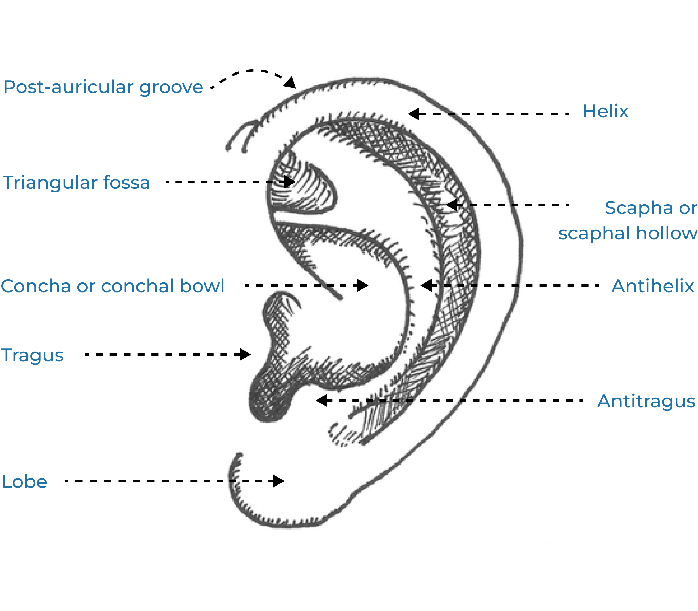 The visible part of the ear (the outer or external ear) is called the pinna or auricle, and just like a fingerprint, every ear is slightly different. The outer ear has its particular shape because of the folds in the thin plate of cartilage which lies within an envelope of skin.