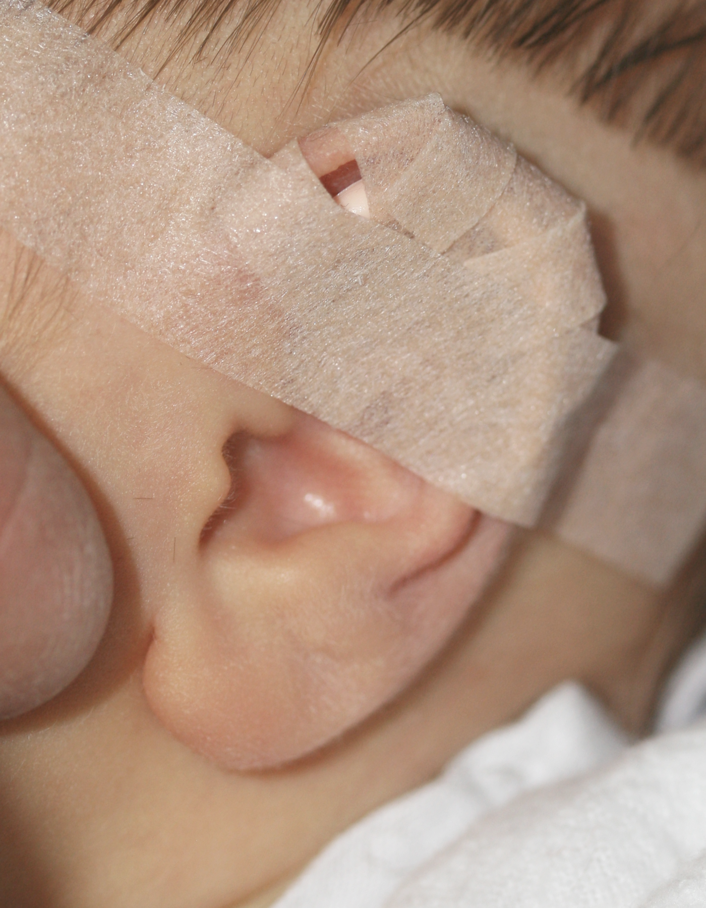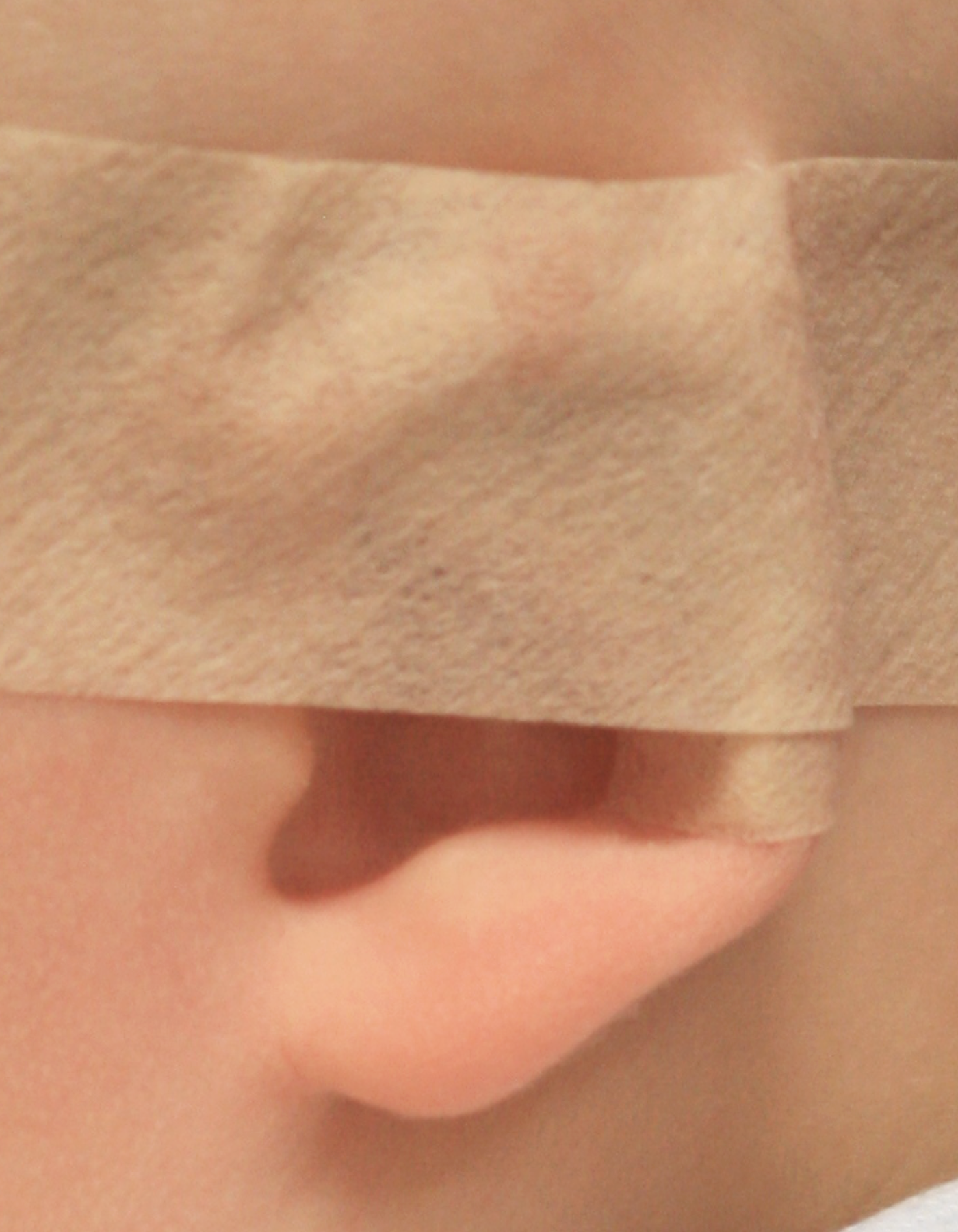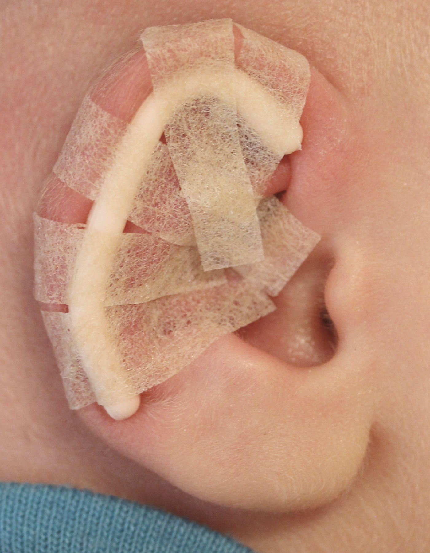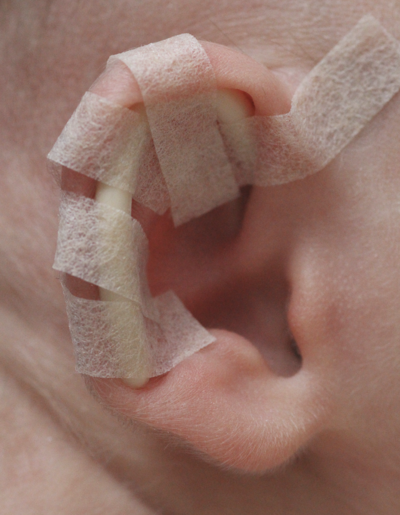 The splints are fitted into the gully (scaphal hollow) of the ear and fixed by narrow strips of tape, and then the whole ear is taped to the side of the head using a wide tape strip. The pressure of the splint in the scaphal hollow resets the natural spring of the ear cartilage, correcting any tendency to make the ears stick out whilst reshaping the proper contours of the rest of the ear. DO NOT simply stick baby’s ear to the side of the head without first fitting the splint. This can distort the shape of the ear, particularly the rim, and is actively discouraged.