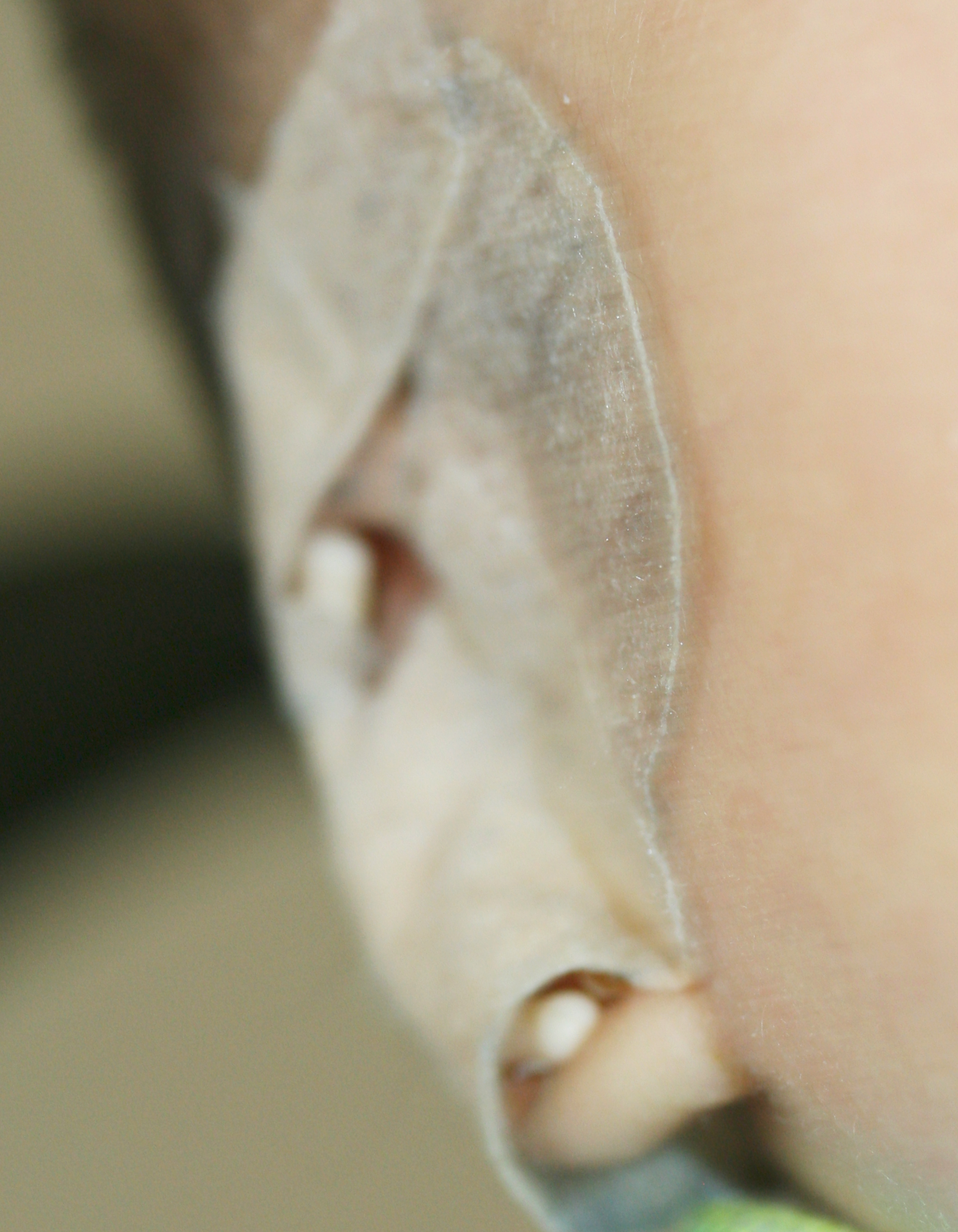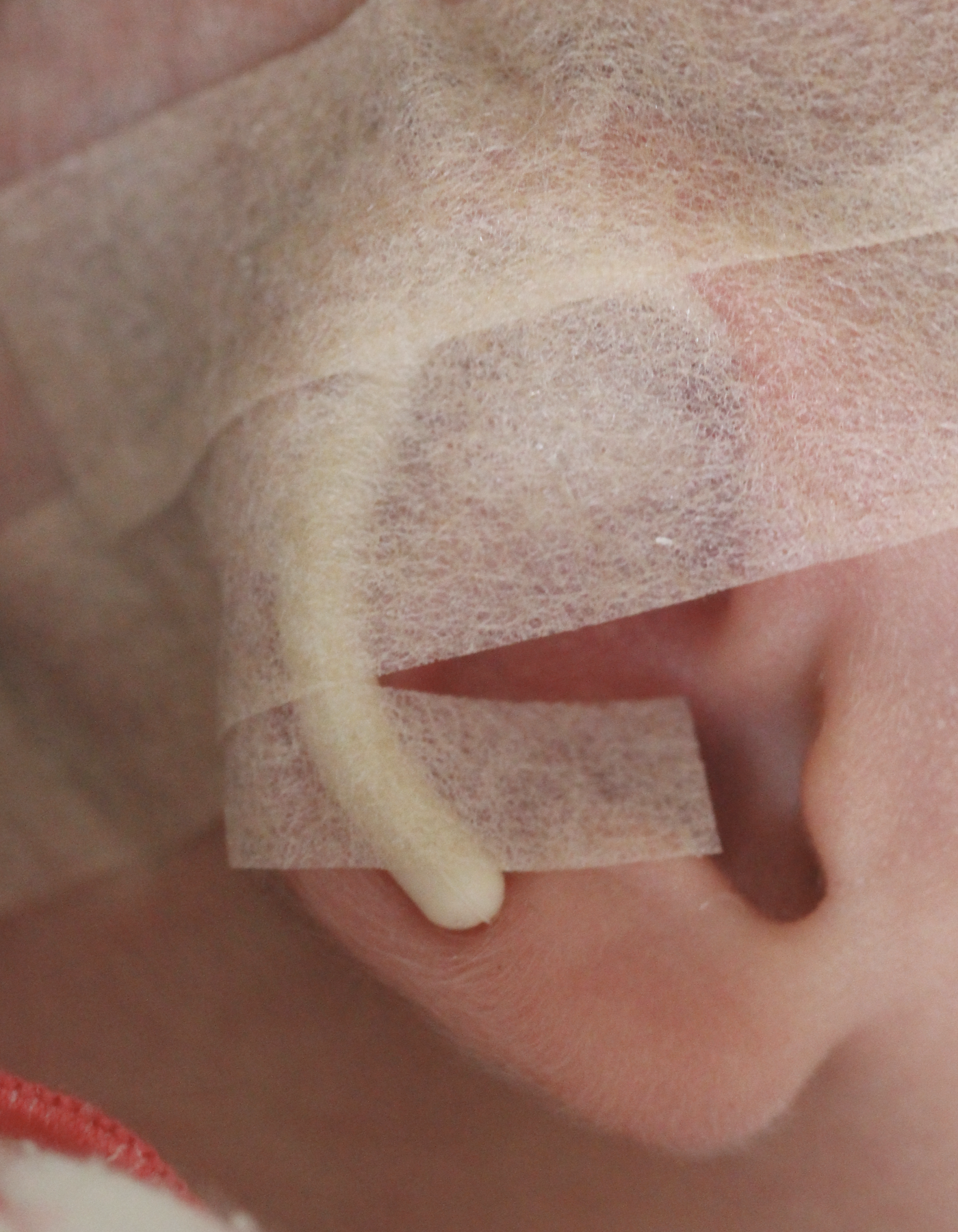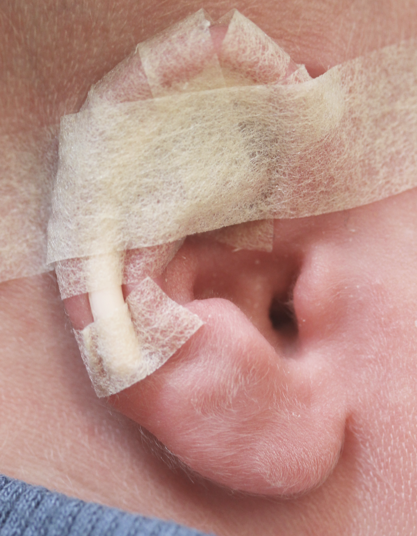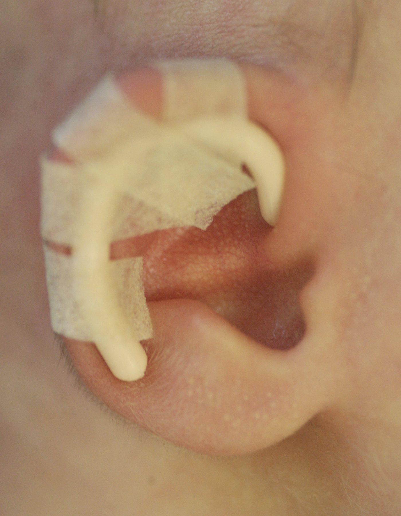 The splints are fitted into the gully (scaphal hollow) of the ear and fixed by narrow strips of tape, and then the whole ear is taped to the side of the head using a wide tape strip. The pressure of the splint in the scaphal hollow resets the natural spring of the ear cartilage, correcting any tendency to make the ears stick out whilst reshaping the proper contours of the rest of the ear. DO NOT simply stick baby’s ear to the side of the head without first fitting the splint. This can distort the shape of the ear, particularly the rim, and is actively discouraged.