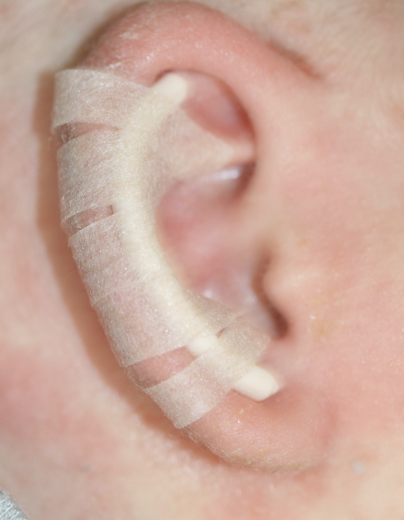 3. Because the cartilage hardens with age, an older baby's ears will take longer to "learn" the new shape than a newborn's ears, and so the splintage period will need to be longer. Older babies are also more dextrous and may be able to use their fingers to pull at the tapes holding the splint in place.